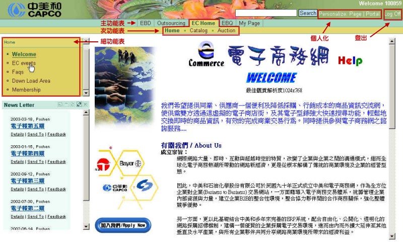 中美和使用 SAP Portal 的入口網站技術,該技術較適合螢幕解析度 1024x768 以上。使用 SAP Portal 入口網站有幾項基本功能如下: