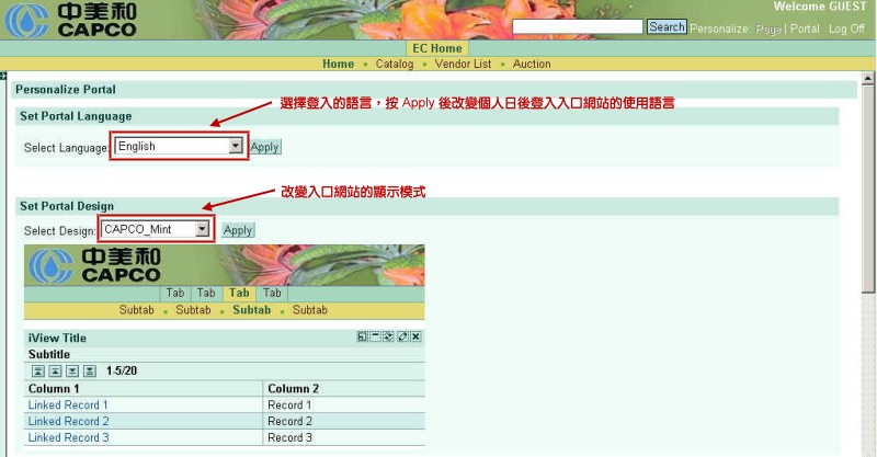 - 個人化:Personalize 容許使用者改變登入後的 Portal style 樣式、使用的 language 語言,如果可能還可以修改各網頁的顯示模式