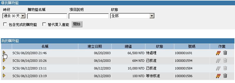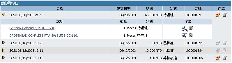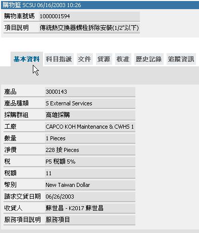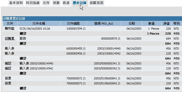 歷史記錄畫面含該購物籃的相關歷史資料例如;驗收交貨、發票、...等記錄