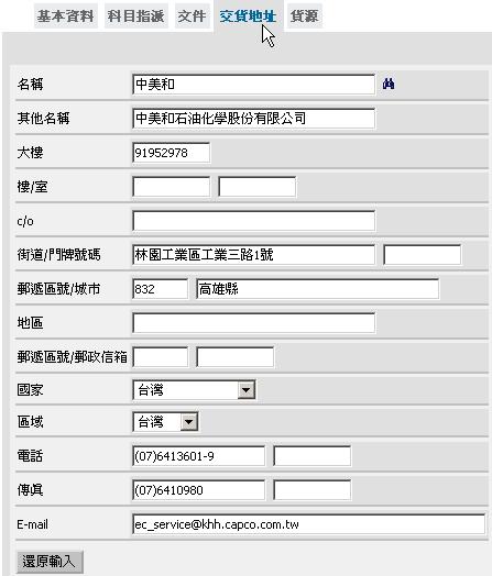 交貨地址畫面含該商品的交貨地址資料