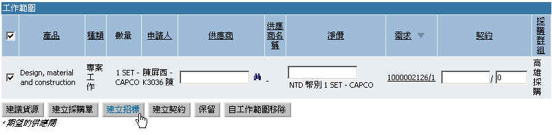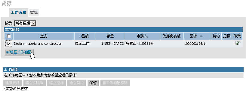 核准後的專案發包申請,會出現於採購的Sourcing貨源處的工作清單中,招標單位之承辦人員勾選待辦之發包申請,按新增至工作範圍納入自己的工作範圍內