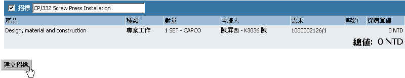 離開Sourcing貨源畫面,到Bidding處理招標畫面,利用搜尋功能找到該發包申請書,按以進入項目細節