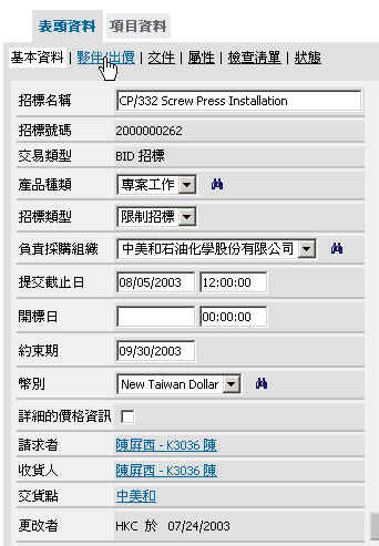 於項目細節基本資料輸入產品種類、招標類型(限制招標)、提交截止日、約束期、幣別...相關資料後,如有內文或相關發包說明文件,先至"|文件|"畫面,輸入內文並上載文件檔案,再到"|夥伴/出價|"畫面輸入受邀標商