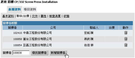 於夥伴出價畫面,利用"尋找競標者"及"新增競標者"鍵,挑出受邀請的報價廠商