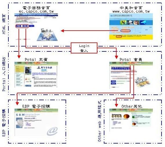 從系統管理面來看,所有的使用者包含中美和、供應商和同業夥伴都透過登入 Portal 入口網站,利用入口網站的 Role 角色管理,行使電子商務的交易功能