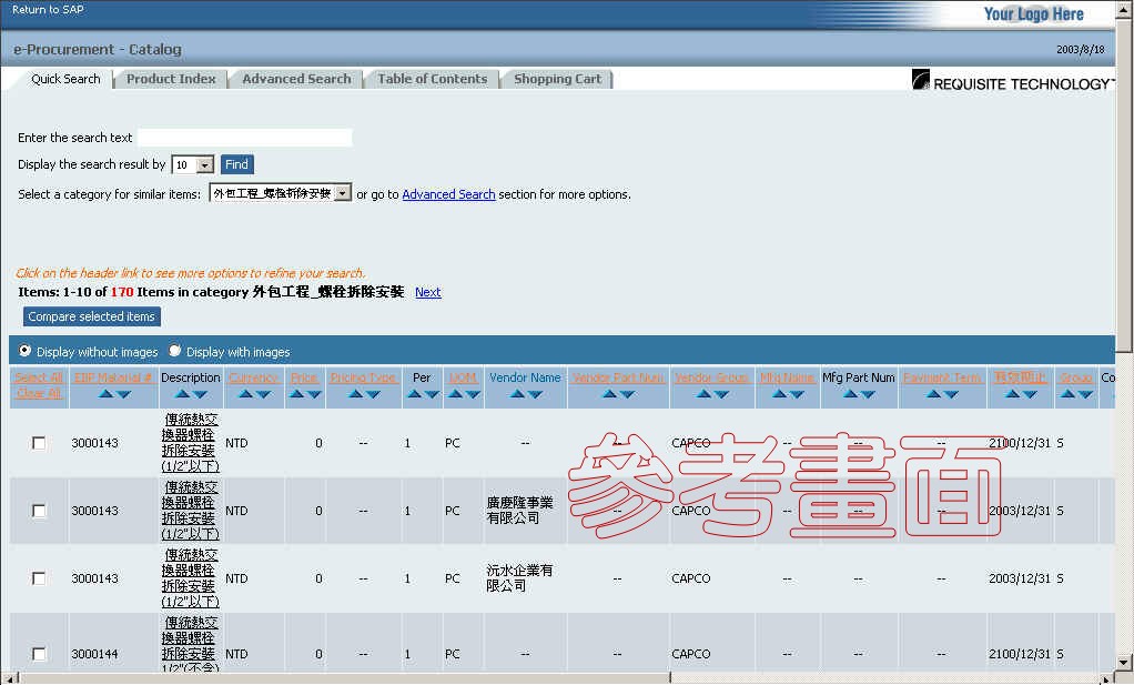 | 電子採購系統使用 SAP EBP(Enterprise Buyer Professional)技術,提供買賣雙方利用網際網路完成電子採購交易的商務平台,可經由中美和的電子商務首頁按"會員區"進入。可以利用搜尋功能強大的電子型錄購物,或利用逆向拍賣reverse auction招標
