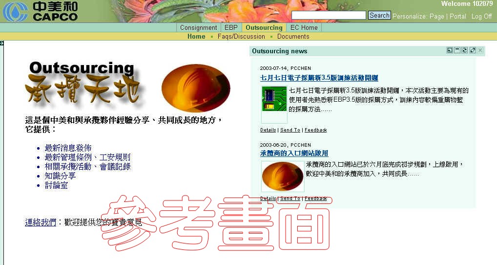 | 來賓區:可經由中美和的電子商務首頁(http://www.capco.com.tw/newsImages/ec_home.html)進入,此區為入口網站的開放區域,提供一般來賓(非會員)參與電子商務的相關活動;例如觀看電子報、電子型錄、拍賣品、下載相關商業、技術文件、...等