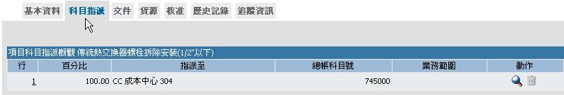 科目指派畫面含該商品的科目指派例如CC 成本中心、OR 工單、WBS 工作細分結構元素